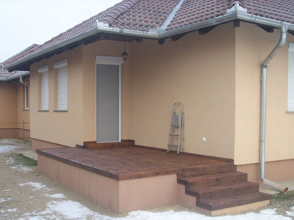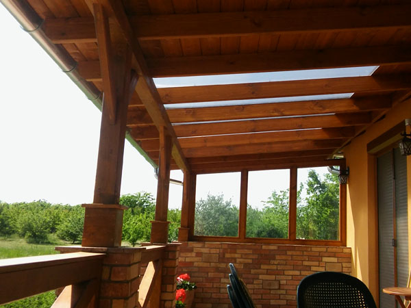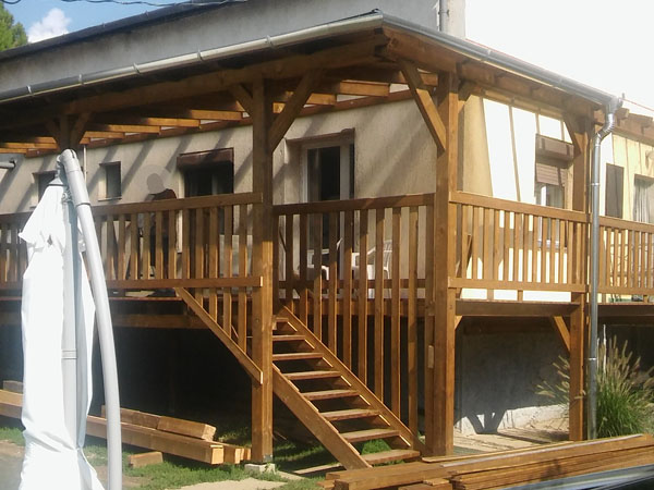 Nyáron az égető naptól véd a terasz, télen a ház bejáratát védi a hótól és az esőtől! Nem csak praktikus (véd az időjárás viszontagságaitól), hanem esztétikus kivitelezéssel a ház dísze is lehet. Nagyon sok helyre lehet építeni: bejárati ajtók fölé, kapubeállóra, ház oldalához ahova autóval beállnak. Főként KVH rendszerű, műszáraz, hossztoldott építési gerenda és lambéria felhasználásával készül, a rákerülő fedőanyag lehet zsindely, cserép vagy színes, illetve átlátszó, víztiszta polikarbonát. Sokszor felmerül, hogy jó lenne egy előtető a bejárati ajtó fölé, de besötétíti a bejáratot, ilyenkor használjuk a polikarbonátot, ami beengedi a fényt, de a csapadékot és az UV-sugarakat nem. Teljes terasz tető: ezzel az egész terasz tetejét beborítjuk, bármilyen cseréppel vagy zsindellyel fedhető. Bevilágítós terasz tető: ez hasonló a teljes terasz tetőhöz azzal a különbséggel, hogy a szarufák közé bevilágító ablakokat rakunk, hogy a fényt ne vegye el a terasztól vagy a terasz mellett lévő szobáktól. Egyedi elképzelések alapján kivitelezzük kívánságát. Előzetes telefonos egyeztetés után, ingyenes helyszíni felmérés keretében, akár azonnali árajánlat is adható. Kültéri munkáknál a szerelési határidőt az időjárási tényezők (eső, hó, szélvihar) befolyásolhatják!
